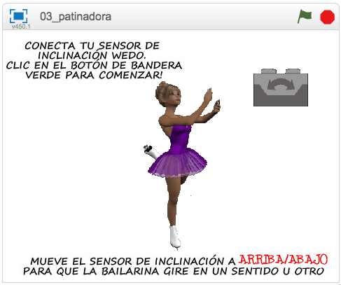 Aplicando el procedimiento explicado en el apartado "PR3. La bailarina" puedes crear una animación similar donde sea posible animar el movimiento de un objeto usando el sensor de inclinación de Lego WeDo 2. Para ello puedes utilizar los activos contenidos en este proyecto: 03_patinadora.sb2